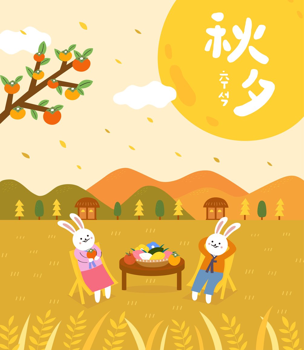 【韓風素材】秋夕插畫 - 月兔柿子秋天韓服田野素材